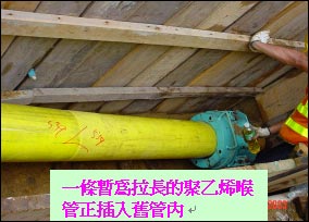 · 用卷扬机将PE管拉入原有管道。