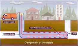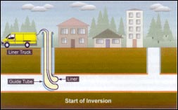 管道翻衬是将由聚合物,玻璃纤维布或无纺纤维材料做骨架,浸渍树脂材料而成,利用水压、气压或卷扬机拉力的作用,将内衬材料反转进入管道的内壁,并在热水、气的作用下,使树脂固化,形成坚硬的内壁。