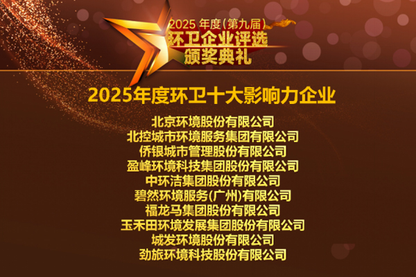 2025年度(第九届)环卫十大影响力企业获奖名单,他们是:北京环境股份有限公司、北控城市环境服务集团有限公司、侨银城市管理股份有限公司、盈峰环境科技集团股份有限公司、中环洁集团股份有限公司、碧然环境服务(广州)有限公司、福龙马集团股份有限公司、玉禾田环境发展集团股份有限公司、城发环境股份有限公司、劲旅环境科技股份有限公司……