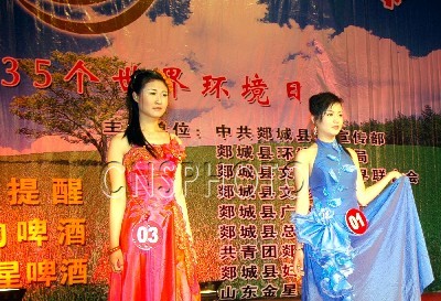 5月25日,为迎接第35个世界环境日的到来,山东郯城县举办“首届环保形象大使”选拔赛,38名参赛选手通过才艺、时装展示及环保知识测试等比赛,选出前10名为郯城县“环保形象代言人”,并将参加“六.五”世界环境日的宣传活动。 2006年6月2日 来源:中新社 房德华摄