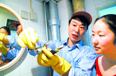 5月16日上午,20多名节水志愿者走进北京市望京花家地南里社区为居民免费安装节水龙头,讲解节水型器具使用办法。(北京晚报)