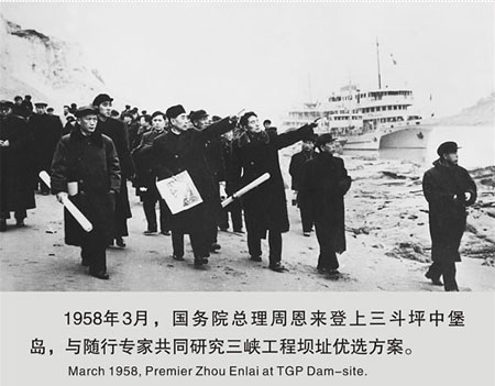 1958年,周总理登上三斗坪中堡岛,与随行专家一起研究三峡工程坝址优选方案。