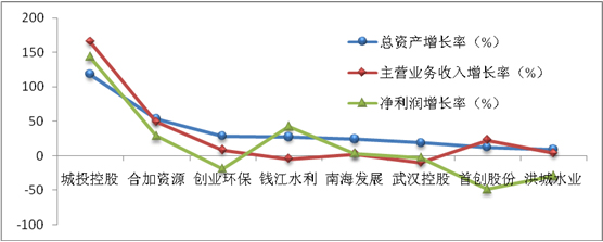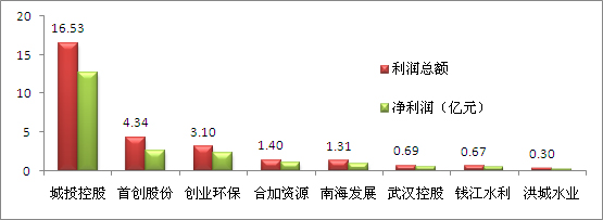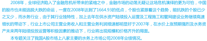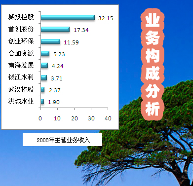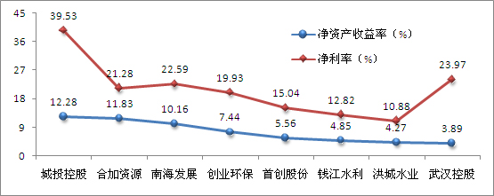 2008年度,这八家水务上市公司的平均净资产收益率为7.54%,城投控股又表现出了良好的获利能力,其净资产收益率为12.28%;其次是合加资源,为11.83%;南海发展的净资产收益率也达到了10%以上;创业环保可说是达到了平均水务,首创股份、钱江水利、洪城水业、武汉控股表现相对差些。从净利润率来看,八家水务上市公司的净利润率平均值为20.76%,其中城投控股依然高居榜首,其净利润率达到了近40%,武汉控股的净资产收益率虽然是八家上水务上市公司中最低的,但是净利润率却相对比较高,仅次于城投控股,达到了23.79%,南海发展、合加资源的净利润率也相对较高,达到了20%以上,从数据上来看,八大水务上市公司的净利润率均达到了10%以上。 |