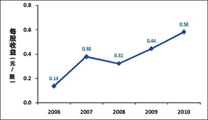 近年来,水务上市公司每股收益的平均水平总体呈现快速上升的趋势。2006年,水务上市公司每股收益平均值仅为0.14元/股,经过几年的发展,至2010年,平均每股收益达到0.58元/股,是2006年的4.14倍,是2009年的1.32倍。