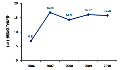 净资产收益率是衡量资金运用效率的核心指标之一。2007年以后,水务上市公司净资产收益率平均值总体稳定,即使2008年受全球金融危机影响有所下降,也未出现大幅波动,基本维持在在14%-16%的区间内。2010年,净资产收益率平均值为15.78%,比2009年下降0.29个百分点。