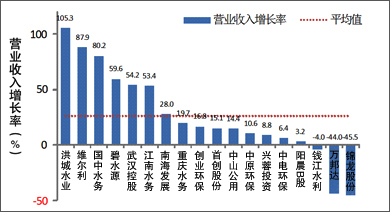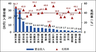 营业收入最高的公司是重庆水务和首创股份,分别为32.7亿元和30.4亿元,多数水务上市公司的营业收入在10亿元以内。