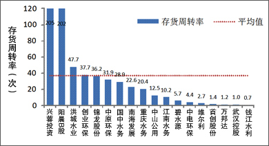 各公司在存货周转率方面表现出很大差异,在此之中土地开发对存货周转率的影响显著。阳晨B股和兴蓉投资的存货周转率最高,均达到200次/年以上,二者存货中都没有涉及土地开发,仅以水处理所需药剂等原材料为主。武汉控股和钱江水利为存货周转率最低的两家公司,在其存货中,均有较大比例土地开发所致的开发成本计入。此外,有工程施工业务的公司存货周转率亦较低,如万邦达、首创股份、维尔利、中电环保和碧水源。