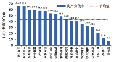 18家上市公司2010年资产负债率平均值为43.8%,有10家公司资产负债率在50%以下,其中碧水源、万邦达资产负债率最低,分别为6.8%和11.8%(成功IPO令其货币资金大幅增加所致)。总体来看水务公司资产负债率基本处于正常范围,经营比较稳健。