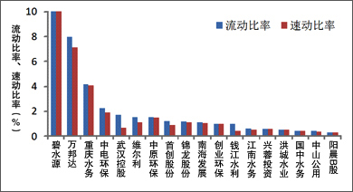 流动比率和速动比率反映企业偿还流动债务的能力。同样是由于2010年成功上市,碧水源和万邦达流动比率、速动比率大幅增高,其中碧水源流动比率、速动比率分别达14.8倍和14.6倍,万邦达则为8.0和7.0倍。江南水务、兴蓉投资、洪城水业、国中水务、中山公用和阳晨B股的流动比率和速动比率偏低,需留意短期偿债风险。