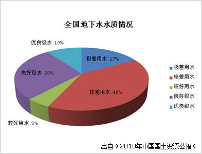 根据《2010年中国国土资源公报》,全国182个开展了地下水水质监测的城市中,有57.2%的城市水质属"较差-极差级"。全国118个大中城市,约有64%,即75个城市的地下水属于较重污染区。