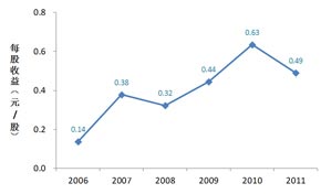 2006年以来,水务上市公司每股收益的平均水平基本保持升势。2011年,多数上市公司净利润水平比上一年有所增加,但水务板块每股收益平均水平则比上一年有所回落。回落的主要原因是部分公司分红扩股导致总股本增加对每股收益产生稀释,以及少数公司2010年因高投资收益带来的高利润具有不可持续性,致使2011年收益水平有较大下降。