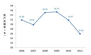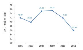 2006年至2010年,水务上市公司资产负债率表现平稳,波动不大,基本集中在40-45%的范围内,行业整体经营稳健,资产负债率水平适宜。2011年,行业资产负债率平均值为35.96%,比上年下降5.91个百分点,主要是由于新股发行或定向增发使部分公司的净资产大幅增长。