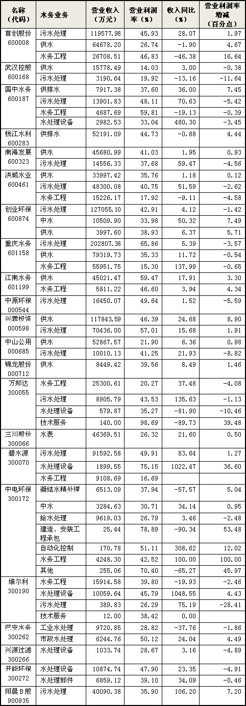 表2是各公司在水务领域的具体业务及其收益情况。在22家水务公司中,从事供水业务的上市公司共12家,该项业务的营业利润率平均值为36.79%。其中兴蓉投资供水业务收入及增幅均为最高,同比增长24.68%至11.78亿元,主要源于成都水价的上调和售水量的增加。