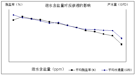 渗透压是水中所含盐分或有机物浓度的函数,含盐量越高渗透压也增加,进水压力不变的情况下,净压力将减小,产水量降低。透盐率正比于膜正反两侧盐浓度差,进水含盐量越高,浓度差也越大,透盐率上升,从而导致脱盐率下降。如下图: