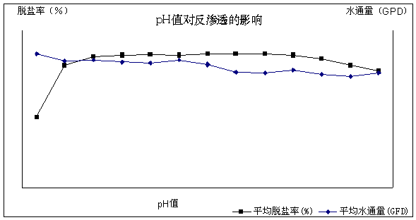 进水pH值对产水量几乎没有影响;而对脱盐率有较大影响。由于水中溶解的CO2受pH值影响较大,pH值低时以气态CO2形式存在,容易透过反渗透膜,所以pH低时脱盐率也较低,随pH升高,气态CO2转化为HCO-3和CO2-3离子,脱盐率也逐渐上升,在pH7.5~8.5间,脱盐率达到最高。如下图