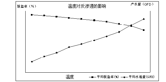 反渗透膜产水电导对进水水温的变化十分敏感,随着水温的增加,水通量也线性的增加,进水水温每升高1℃,产水通量就增加2.5%~3.0%;其原因在于透过膜的水分子粘度下降、扩散性能增强。进水水温的升高同样会导致透盐率的增加和脱盐率的下降,这主要是因为盐分透过膜的扩散速度会因温度的提高而加快。如下图.