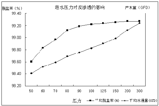 进水压力本身并不会影响盐透过量,但是进水压力升高使得驱动反渗透的净压力升高,使得产水量加大,同时盐透过量几乎不变,增加的产水量稀释了透过膜的盐分,降低了透盐率,提高脱盐率。当进水压力超过一定值时,由于过高的回收率,加大了浓差极化,又会导致盐透过量增加,抵消了增加的产水量,使得脱盐率不再增加。如下图