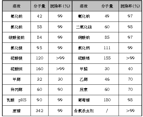 过99%,对单价离子如:钠离子、钾离子、氯离子的脱除率稍低,但也超过了98%;对分子量大于100的有机物脱除率也可达到 98%,但对分子量小于100的有机物脱除率较低。